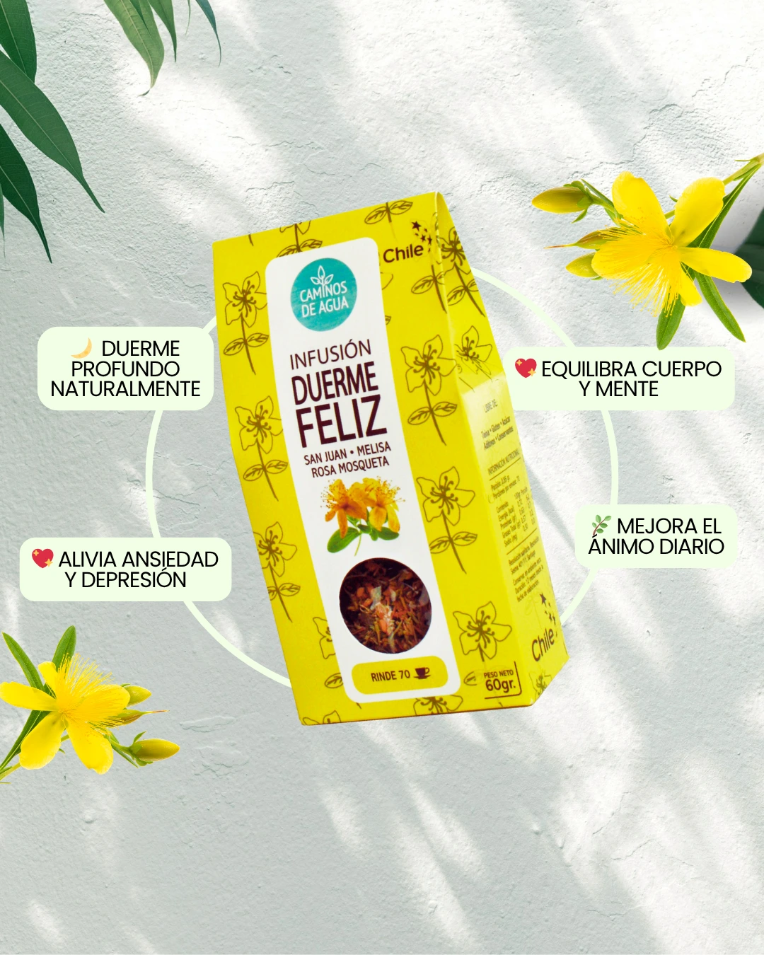 Relaja tu mente y disfruta de un sueño reparador con nuestra infusión Duerme Feliz, mezcla de Hierba de San Juan, Melisa y Rosa Mosqueta.